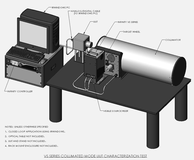 此圖展示了 SBIR VS 系列在準直模式下進行待測物 (UUT) 光學特性分析的設置範例,IRWindows PC 透過訊號線連接至 UUT,而 UUT 的光路徑則對準 Infinity VS 系列光源系統;此光源系統包含可見光發射器及 目標輪,發出的光線會經過 準直儀 的處理,形成均勻的平行光束投射至 UUT;位於 IRWindows PC 下方的 Infinity 控制器負責整體光源系統的運作,此配置目的在於精確地量測和分析 UUT 在平行光照射下的各項光學特性。