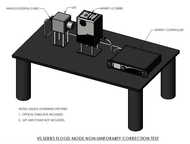 此圖呈現了 SBIR VS 系列在泛光模式下進行非均勻性校正測試的範例配置;待測物 (UUT) 位於畫面左側,並透過纜線連接至控制系統;UUT 正對著右方的 Infinity VS 系列光源。與準直模式不同,此模式下的光源直接以泛光形式照射 UUT,並未使用準直光學元件;位於實驗桌右側的 Infinity 控制器則負責控制光源的輸出。此配置的主要目的是評估並校正 UUT 在大範圍照明下的光照均勻性表現。