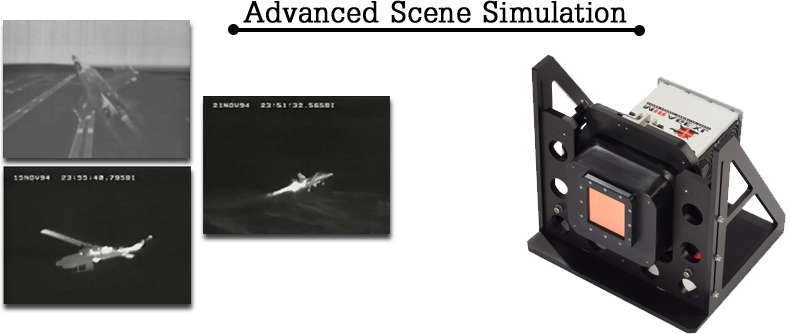 SBIR 先進場景模擬方案以 MIRAGE 系列動態紅外線場景投影機為核心,產生高解析度紅外線影像,模擬複雜熱環境與目標;左側展示動態場景模擬範例,具時間戳記,模擬真實世界熱變化;MIRAGE 紅外線投影機應用於先進場景模擬,產生逼真動態影像,滿足國防、航太等領域精確測試評估需求。