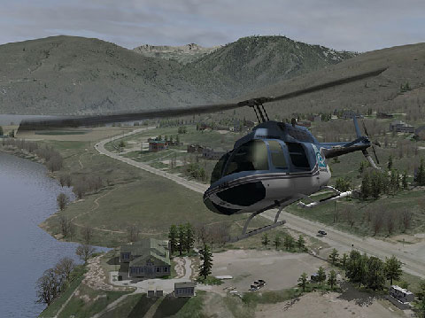 圖中為一架直升機在低空飛行,背景為山區與湖泊,地面有道路與建築物,呈現出高擬真的環境細節,展現精細的地景渲染與動態光影效果,適用於飛行訓練或戰術模擬應用。Quantum3D 的優勢