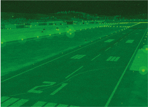 圖中為夜視裝置模擬效果,可見機場跑道與燈光在綠色單色調的夜視影像中顯示,並伴隨感測器雜訊與光暈效應,此效果來自 MANTIS QUEST 2 外掛模組,該模組支援感測器後處理特效,可模擬增益、自動增益控制、模糊、隨機雜訊、固定雜訊、閃爍與熱點對比估算,適用於 夜視設備、紅外線感測器與飛行模擬,提供高擬真的感測器影像處理與戰術訓練應用。MANTIS QUEST2 外掛模組(MANTIS QUEST2 Plug-In)
