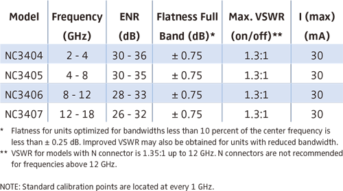 NC3400 系列 AWGN 雜訊源規格,涵蓋頻率、ENR、平坦度、VSWR 及電流參數,適用於 ATE、雷達與高雜訊係數量測。