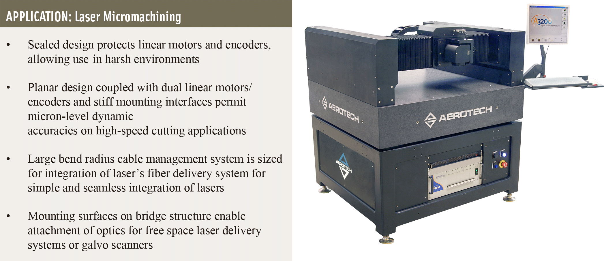 憑藉多年精密定位與控制系統製造經驗,Aerotech 提供即插即用的完整解決方案;常見選配包括 Z-Theta 機構、可容納自動化零件處理設備的升降架、光束移動光學系統支架(Flying Optics System Mount)、隔離系統、整合控制與電子子系統的機台基座。