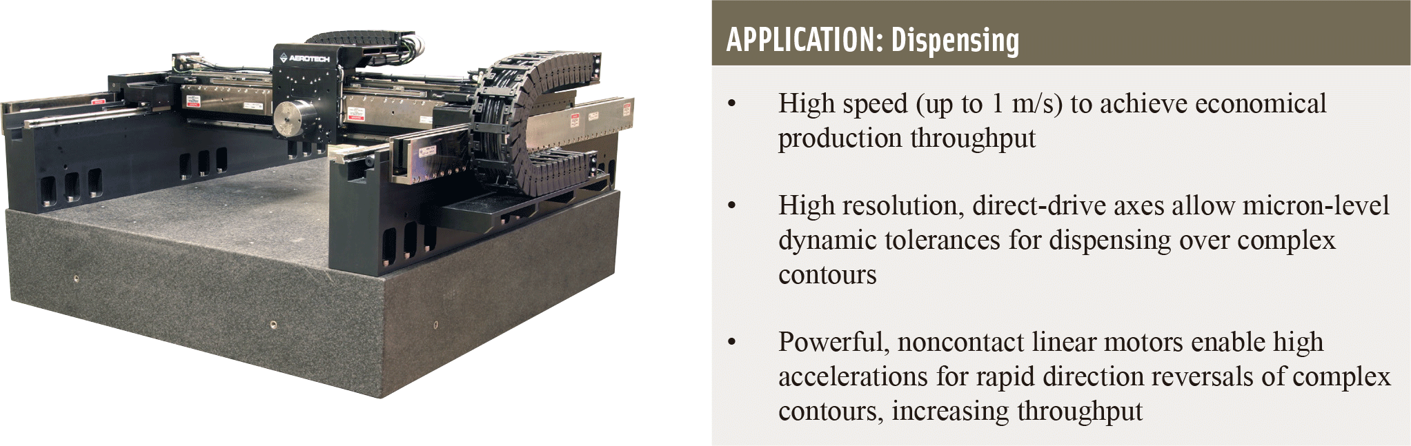 Aerotech 設計並製造適用於全球多家頂尖製造商的龍門系統,這些系統在各種應用領域中展現卓越性能,包括高速拾取與放置、自動化組裝、視覺檢測、點膠站與包裝應用;憑藉豐富的經驗與多元產品線,Aerotech 能為您的應用提供最理想的龍門系統。