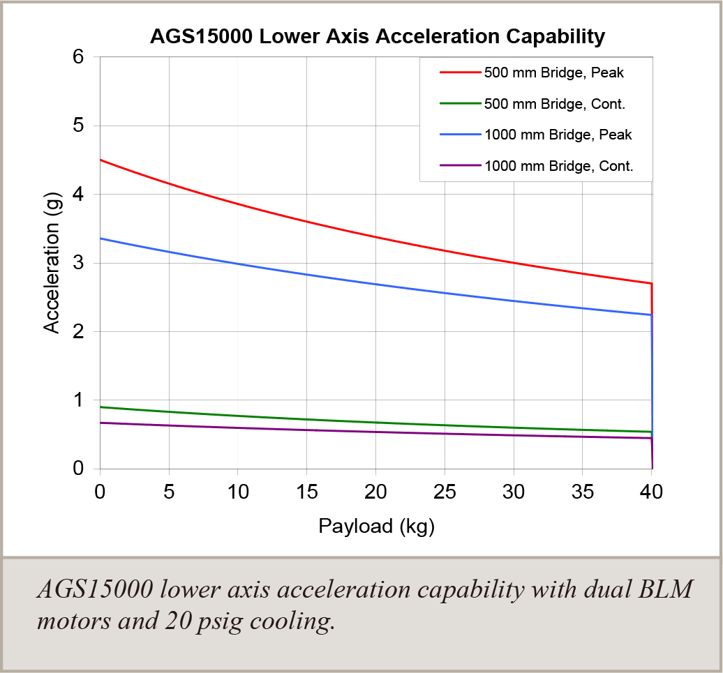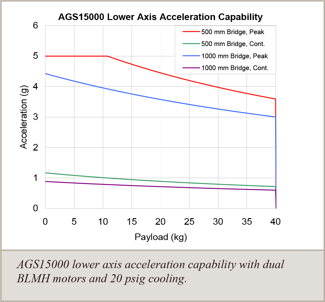 本圖顯示 AGS15000 在搭載雙 BLMH 馬達與 20 psig 冷卻條件下的下軸加速度能力,涵蓋不同橋架長度(500 mm 和 1000 mm)在峰值與連續運行模式下的性能