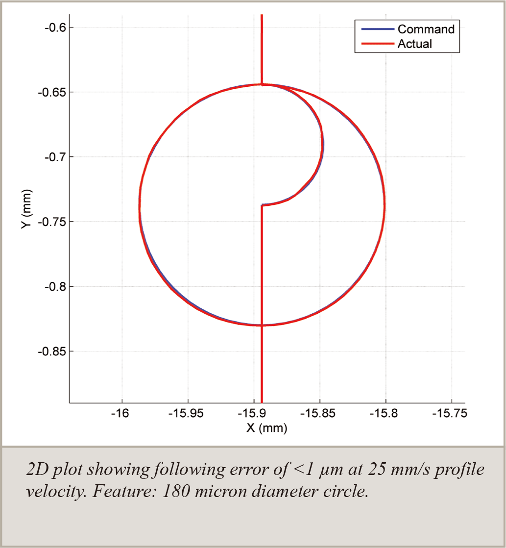 2D 路徑誤差分析顯示 AGS15000 在 25 mm/s 輪廓速度下,180 微米直徑圓形軌跡的跟隨誤差小於 1 微米