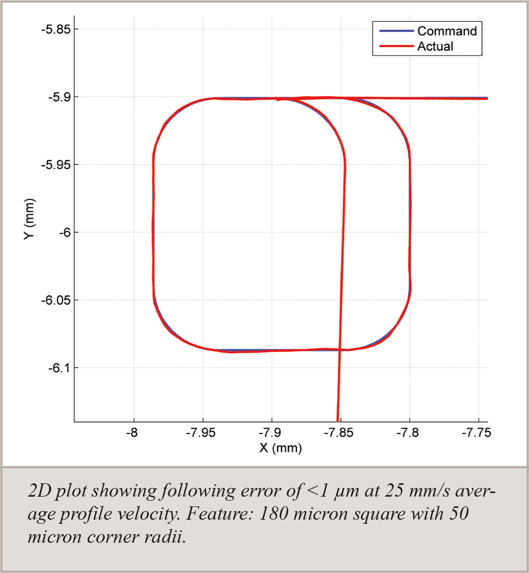 此圖顯示 AGS15000 在 25 mm/s 平均輪廓速度下,180 微米方形軌跡(角半徑 50 微米)的跟隨誤差小於 1 微米