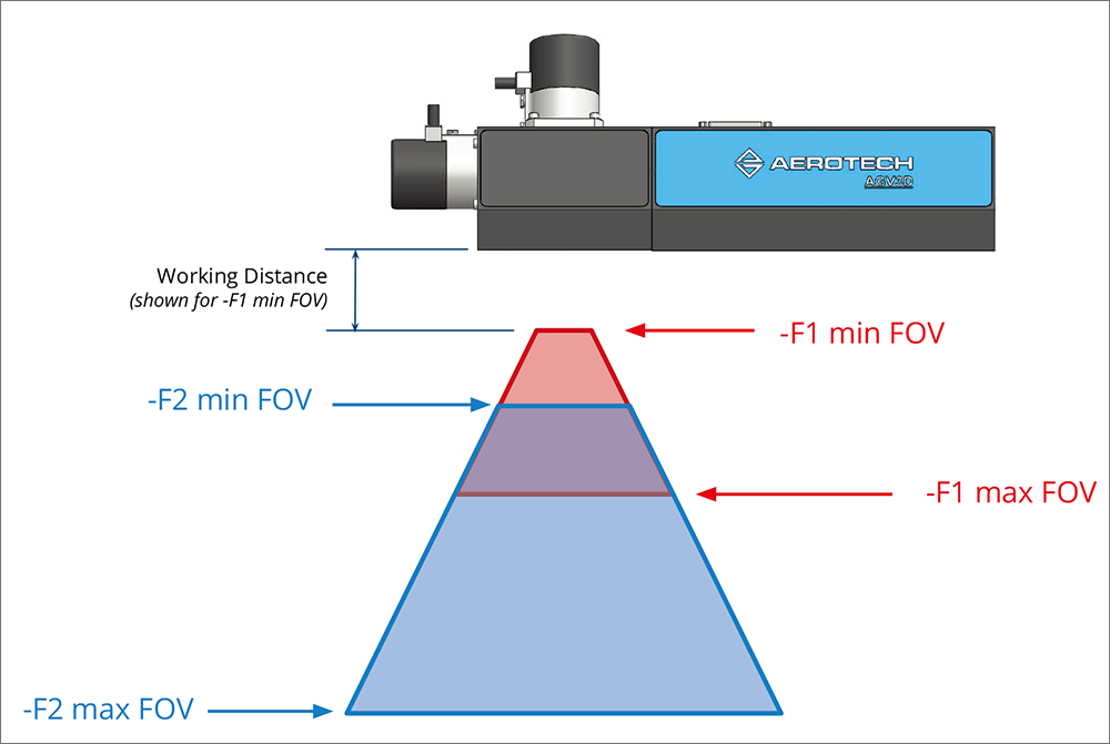 此圖為 AGV3D 雷射掃描頭的工作範圍示意圖,其具備兩種使用者可選擇的視野模式配置(F1、F2),分別對應不同的工作距離與視野(FOV)範圍,展現了從最小到最大的視野調整彈性,以適應多樣化的 3D 加工應用。創新的直驅式聚焦技術