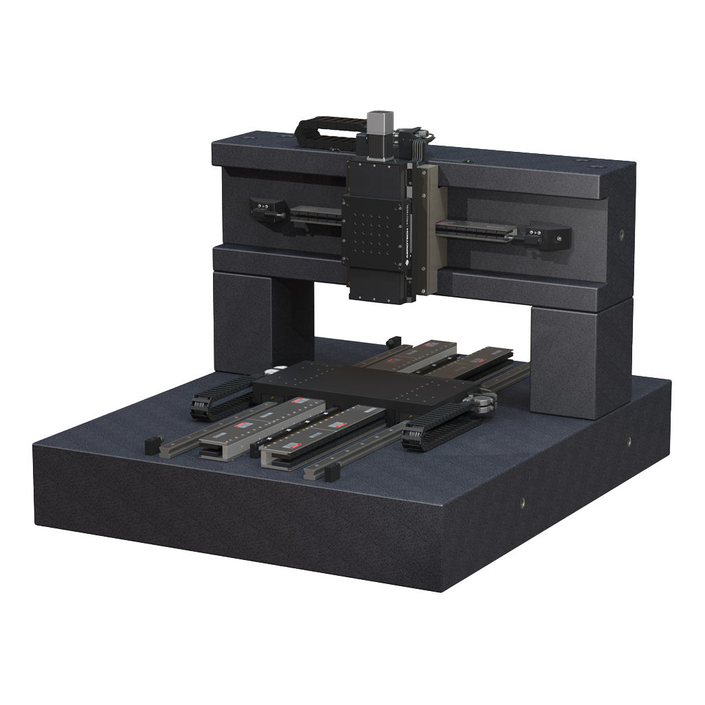 這種設計不僅能根據不同應用需求靈活配置,還能以其堅固的花崗岩基座結構 (Granite Base Structure) 提供出色的剛性與穩定性,有效降低震動與熱膨脹影響,確保整體系統的高精度運動表現。