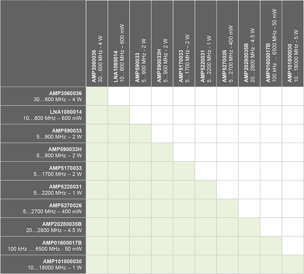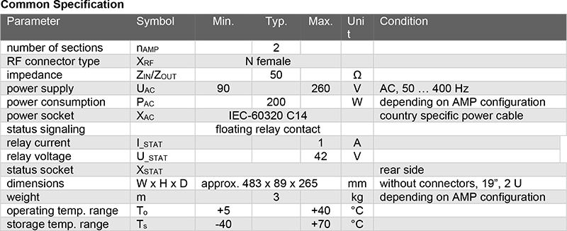 Becker 提供完整且多樣化的 AMP 放大器模組選項,可直接整合於 AMP-LR 機架式機箱中,支援不同頻段與輸出功率等級之應用需求。更多模組規格與選型細節,請參閱下方訂購指南。