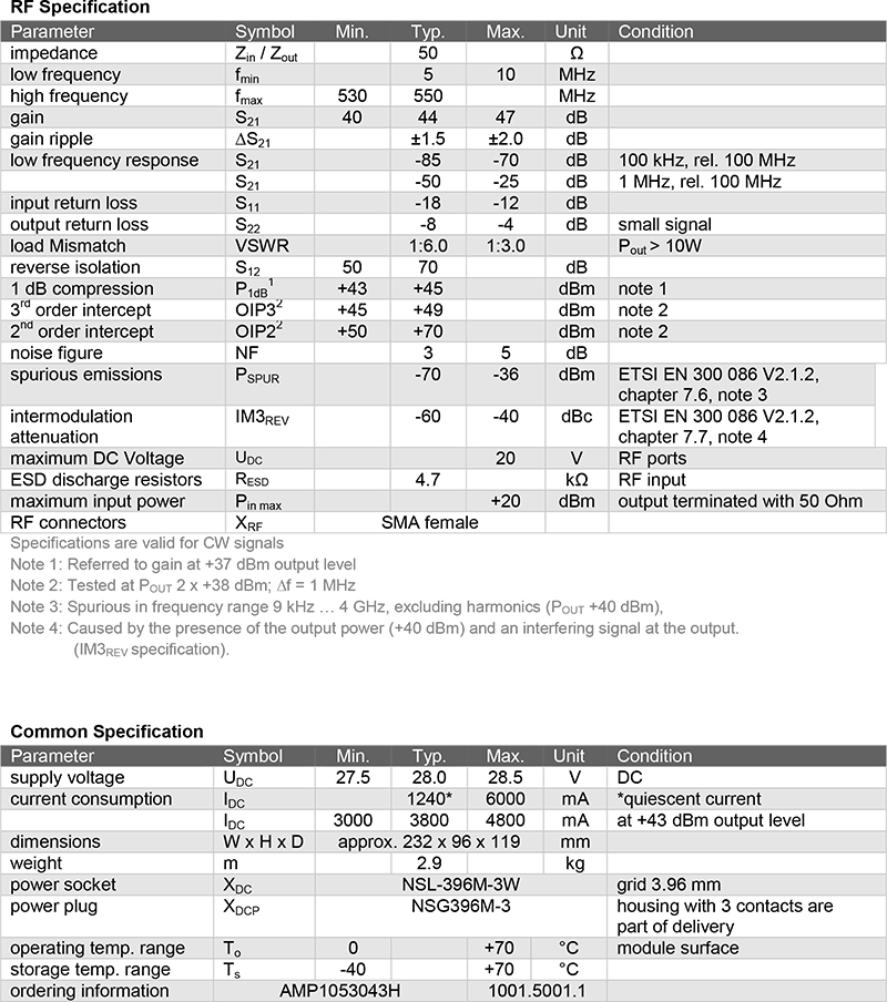 AMP1053043H 可直接應用於無線電通訊設備之發射模組中,並已通過 ETSI EN 300 086 V2.1.2 標準測試,此標準為歐盟 RED 指令(2014/53/EU)之調和標準之一,涵蓋了發射器在雜散訊號(Spurious Emissions)與交互調變干擾(Intermodulation Resistance)方面之嚴格要求;模組設計完全符合該標準,有助於設備通過歐盟市場安規與通訊認證流程。
