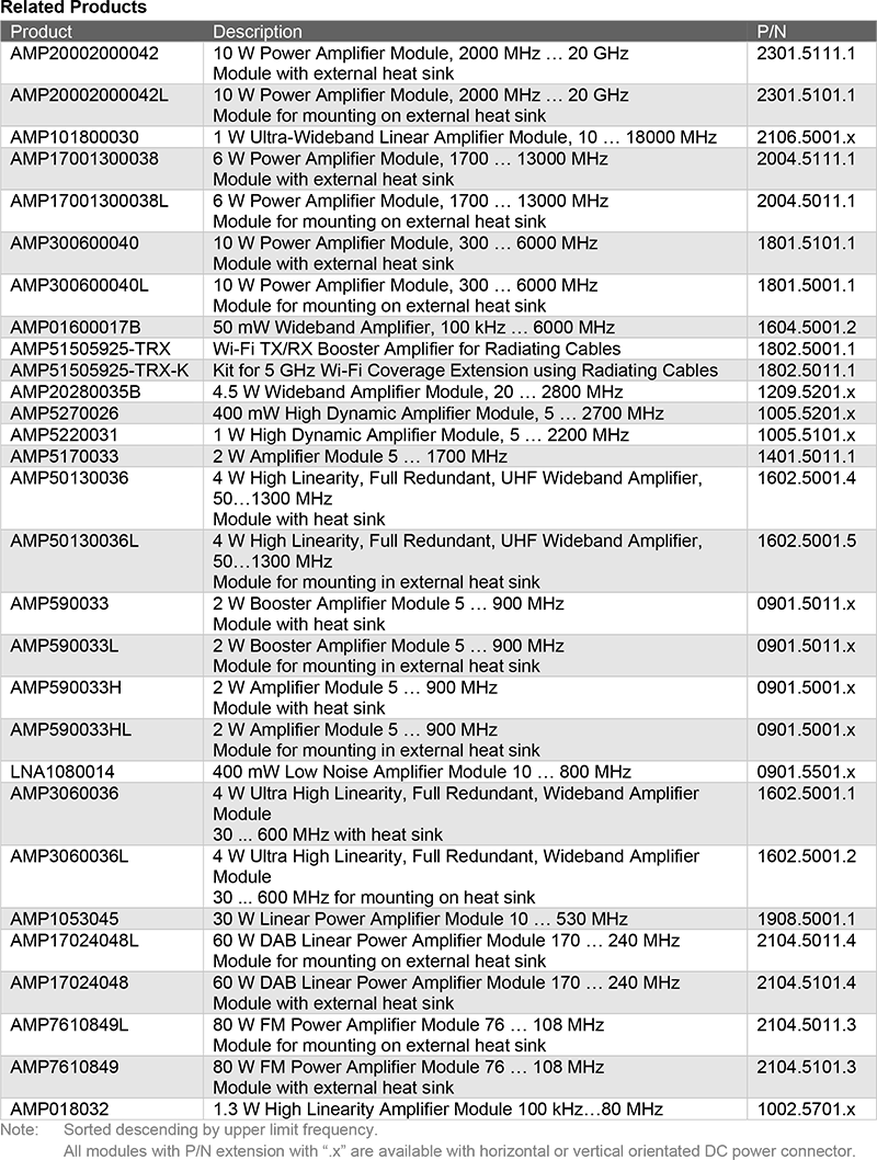 內部整合高效濾波器與低雜訊穩壓供電電路,有效抑制雜散訊號(spurious signal),提升輸出訊號純度,電源供應具備反極性保護設計,避免安裝錯誤造成損壞;同時支援寬範圍直流電壓輸入,應用彈性更高。模組外殼設有 LED 指示燈,可清楚顯示電源狀態與模組運行狀態;此模組設計為外部散熱器安裝型,可由使用者依應用需求搭配合適散熱方案。