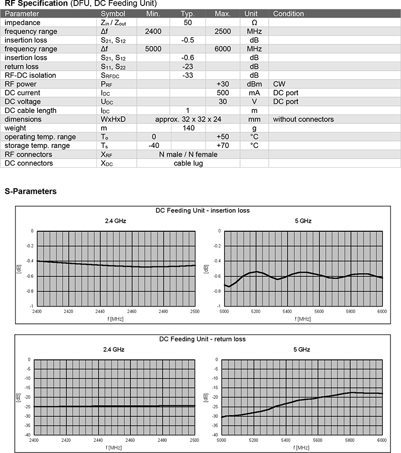 DFU 為 AMP51505925-TRX 提供 24 V 虛擬直流電力,透過 RF 埠供電並轉送至放大器模組,支援最多 4 組 Wi-Fi 放大器串接,可延伸 最多 5 段輻射電纜段,大幅提升涵蓋彈性與部署效率,該模組設計可直接安裝於輻射電纜前端 N 型母接頭上,簡化現場安裝流程。