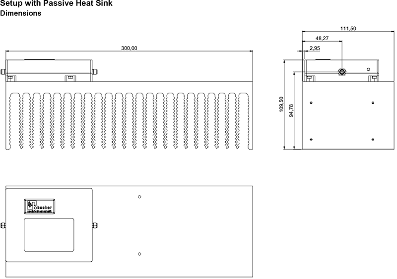 此放大器模組封裝於經 CNC 加工之鋁製機殼中,有效保護電路元件避免受損,並提供優異的電磁干擾(EMI)屏蔽效果;標準模組設計供安裝於使用者提供之散熱器上,亦可選購原廠對應散熱模組。