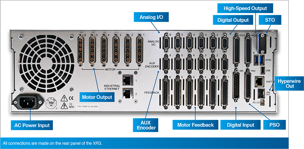 Automation1 iXR3 的後方面板整合了所有必要的連接埠,提供完整的系統擴充與控制能力;面板上清晰標示了各項功能介面,包括:交流電源輸入、馬達輸出、工業乙太網路、輔助編碼器、馬達回授、類比/數位 I/O,以及用於高速同步控制的 PSO (位置同步輸出)、STO (安全轉矩關閉) 與 Hyperwire 介面,所有系統連線均可於此完成。
