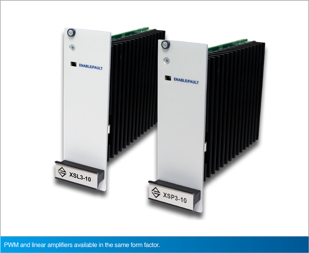 iXR3 驅動機架可依據應用需求,選配採用相同機構尺寸的 PWM 脈寬調變放大器與線性放大器,此設計確保了兩者在系統中的安裝與替換具有一致性與便利性,前面板上亦配置了 ENABLE 與 FAULT 狀態指示燈,方便使用者快速判讀運作狀態。