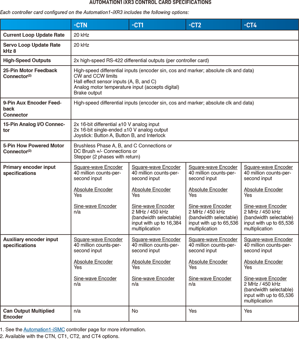 iXR3 的馬達電路由功能強大的控制器卡所驅動,能以 20 kHz 的頻率閉合伺服迴路電流迴路,這些控制卡同時也提供多項其他高速、低延遲的控制特性,用以提升您的製程產能與品質;此 iXR3 裝置可即時處理數位與類比 I/O高速資料收集高速差動輸出位置同步輸出以及編碼器倍頻功能,而 EtherCATModbus TCPSocket 介面,更讓此裝置能夠實現真正的全機台與運動系統控制。