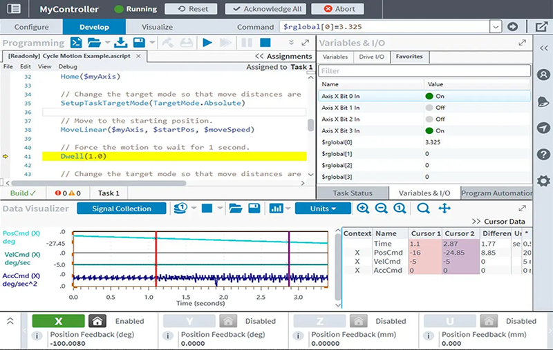 您可以使用 Data Visualizer 這款強大的數位示波器來分析設備的效能資料,它能夠存取來自控制器和驅動器的數百種訊號,並以 1D、2D 及頻域等多種方式呈現資料。您不僅能檢視來自實際馬達驅動器的回授訊號,還可以透過虛擬軸進行運動控制的系統模擬。