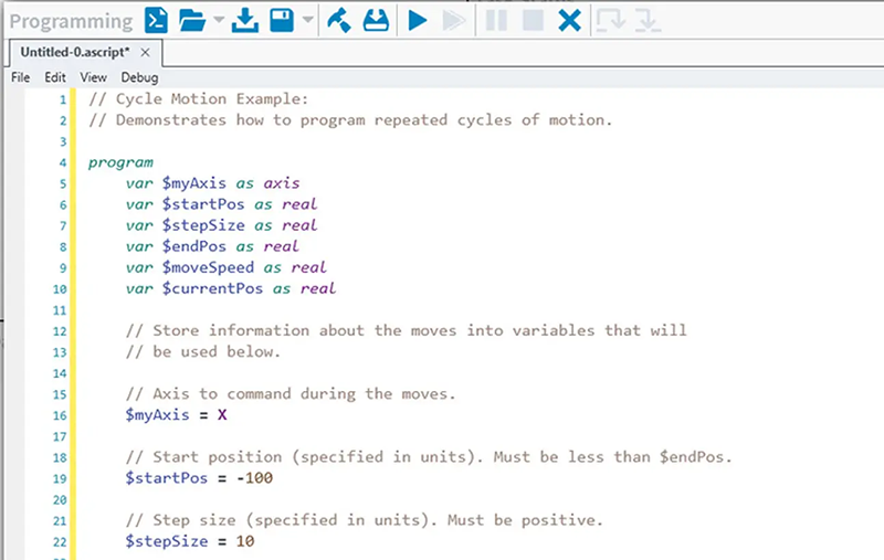 Aerotech AeroScript™ 程式設計語言將運動控制、G-code 與製程控制指令整合為單一語言,專為精密自動化應用而設計。AeroScript 具備陣列、結構、程式庫等多種現代化特性。