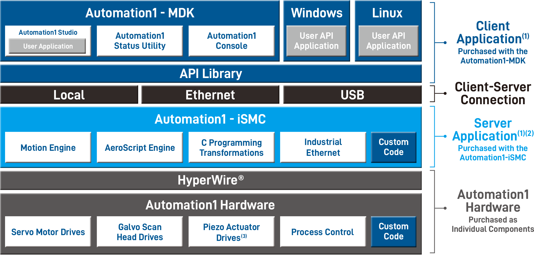 Automation1 平台採用分層式架構,清晰地劃分軟體與硬體;上層的客戶端應用程式,如 Automation1-MDK 與使用者 API,可運行於 Windows 或 Linux 系統;這些應用程式透過 API 函式庫,經由乙太網路或 USB 等介面,與核心的 Automation1-iSMC 伺服器進行通訊;iSMC 內部整合了運動引擎與 AeroScript 引擎,負責執行所有控制邏輯,並透過高速的 HyperWire® 匯流排,即時驅動底層的伺服馬達、檢流計掃描頭等硬體元件,形成一個完整且高效的運動控制生態系統。