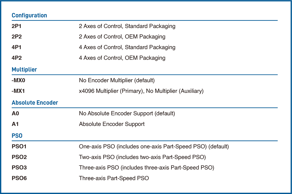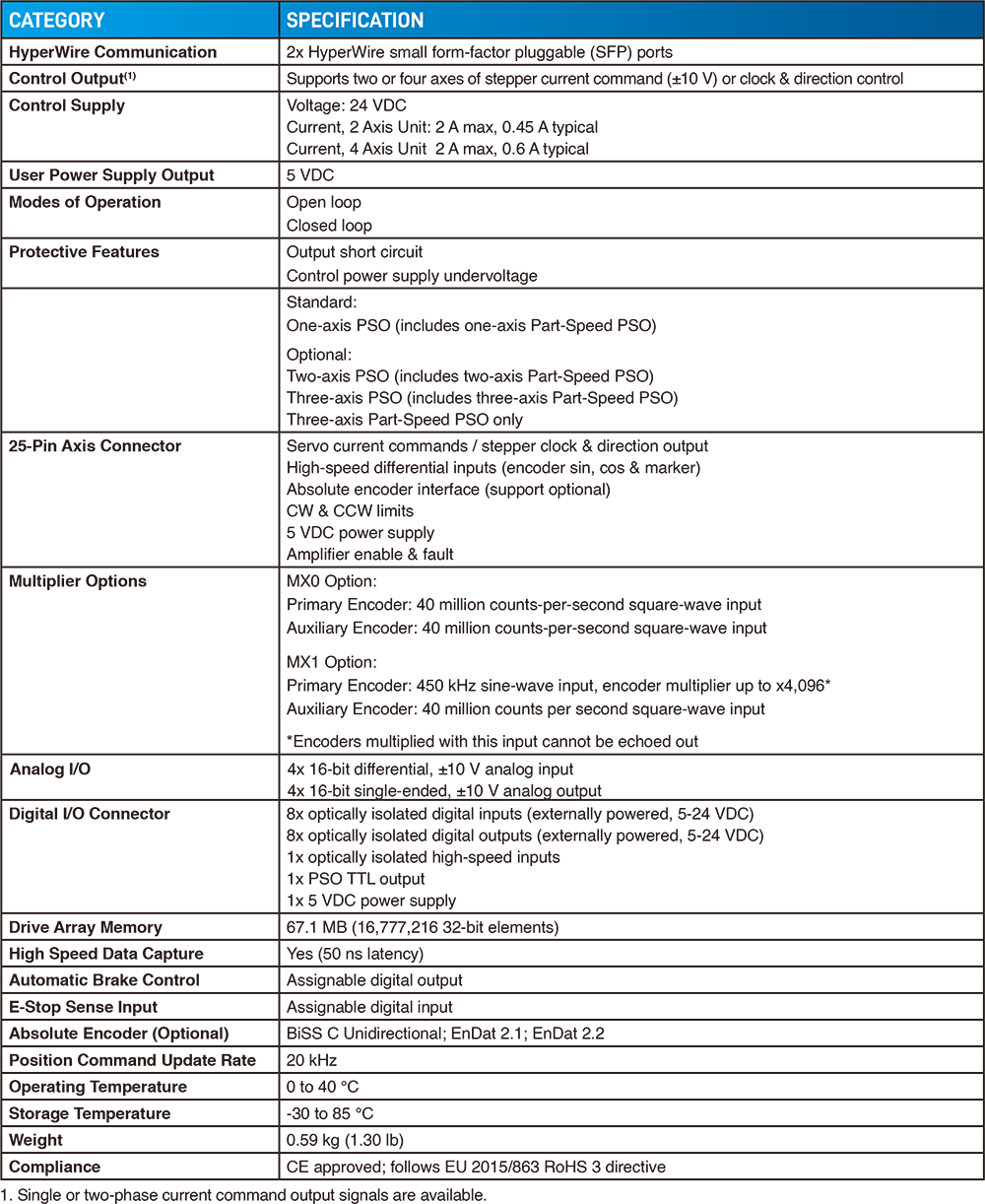 - 模組支援:單一連接器軸介面,其整合了類比控制輸出、編碼器回授、2 組行程終點 (EOT) 極限輸入、標記輸入、放大器致能與故障訊號,並提供選配的絕對型編碼器支援。