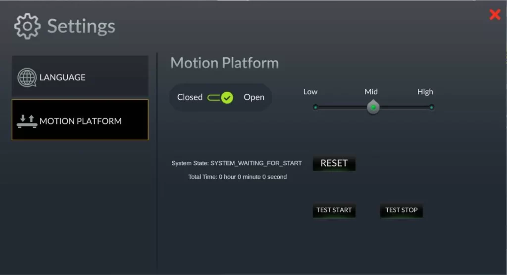 在 VR 推土機模擬器中,使用者可透過介面調整動態平台的反應強度,以對應真實環境中的操作感受:
