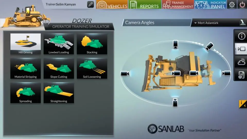 多元攝影機視角讓操作員能觀察機具與周遭環境,提升訓練過程中的安全性與效率;SANLAB 的建築模擬器提供多種攝影機視角,確保訓練全面、真實;推土機模擬器支援的虛擬實境(VR)攝影機視角包括:
