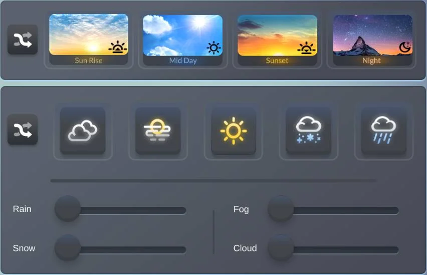 SANLAB 的推土機模擬器支援真實氣候條件模擬,提供沉浸式訓練體驗。透過先進圖形技術,模擬器能重現多種天候、時段與季節狀況;操作員可在不同環境中進行訓練,例如日出、正午、日落及夜間,天氣可調整選項包括:雨、雪、霧、雲與陽光,且各項天候皆支援強度調整功能;即時天氣模擬有助於操作員因應實際工地作業中的環境挑戰,強化臨場應變與操作穩定性。