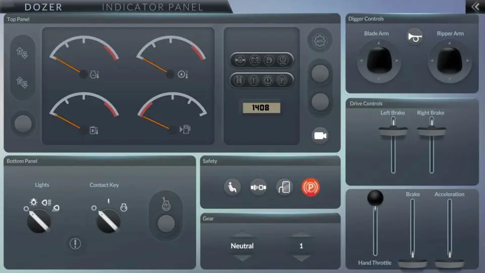 模擬器的控制面板顯示目前作業狀態、溫度讀數與搖桿操作情形,並包含油門與煞車踏板等控制裝置,還配有燈光與雨刷功能。其他主要控制元件包括: