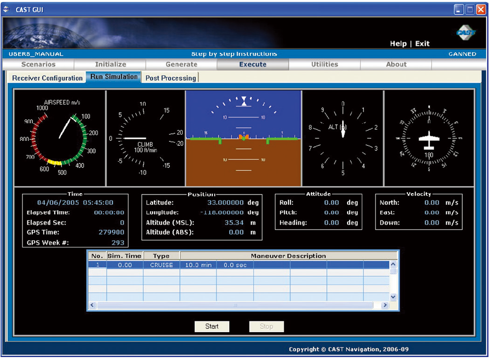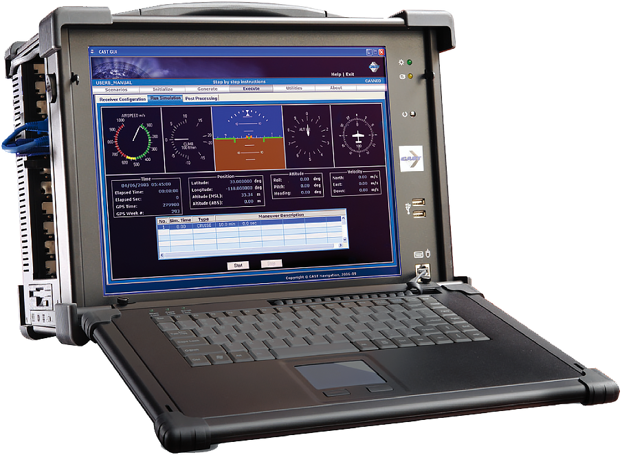 使用者可透過完整的任務輪廓設定,或匯入現地收集之六自由度(6-DF)動態輪廓資料,產生精確任務軌跡;CAST-1000 同時內建效能評估模組,可將 GPS 導航系統接收到之原始量測資料與濾波後資料進行比較,並與真實載具位置對照,協助完成高精度的後測分析(Pst-Test Analysis),以驗證導航演算法、硬體效能與整體系統準確性。