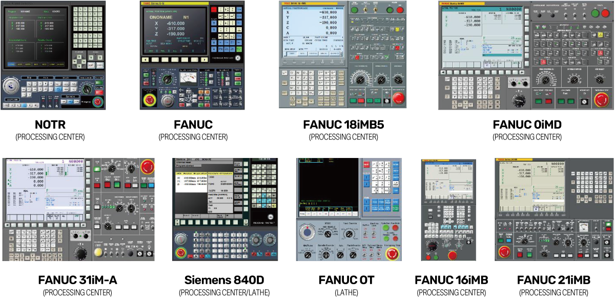 CNCPro 提供多種控制器選擇,如 Fanuc 系列控制器 及 Siemens 控制器,這些控制器配備軟體功能鍵(soft key),可模擬實體控制器的各項功能操作。