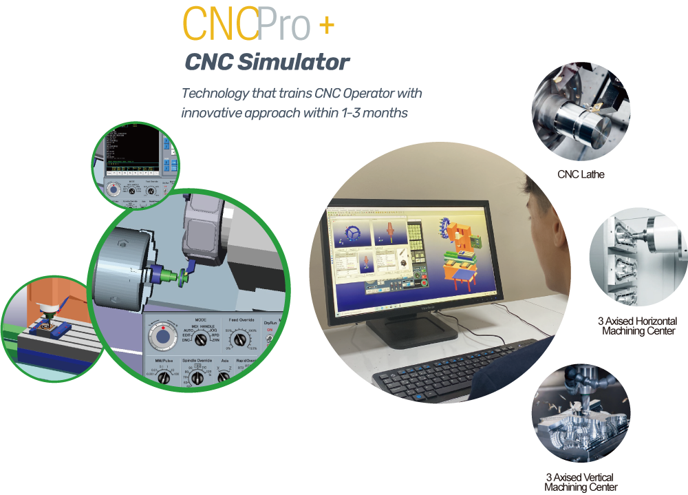 CNCPro+ CNC 模擬器學習系統:CNCPro+ 提供創新模擬教學平台,可在 1–3 個月內有效培訓 CNC 操作員,透過高擬真的虛擬機台操作介面,支援 CNC 車床、三軸臥式加工中心、三軸立式加工中心等多種機型訓練,全面提升使用者的程式編寫與加工實務能力。