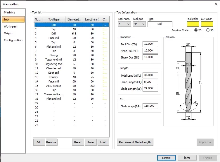 CNC 模擬器的刀具設定與資料管理介面:使用者可在此介面中設定刀具種類(如鑽頭、攻牙刀、銑刀等)、直徑、長度、刀刃角度等參數,並以 2D 或 3D 預覽方式顯示工具外觀;右側的「Tool Information」區域可輸入詳細幾何尺寸,如刀頭直徑(TD)、總長度(TL)、刀刃長度(BL)與刀角(Blade Angle)等,實現與實際加工一致的模擬設定;支援多達 24 組刀具資料的編輯、儲存與匯入。