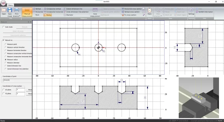 CNC 模擬器的技術圖面與量測功能介面:圖面介面顯示上視圖與側視剖面圖,搭配座標格線與尺寸標註工具,使用者可量測孔徑、半徑、距離與角度等幾何特徵;左側功能列支援垂直/水平/連續量測模式,並可切換 XZ 或 YZ 平面剖視圖,右下角為對應的工件 3D 模擬圖,提供即時比對與確認設計精度。