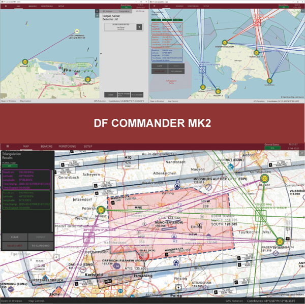 DF Commander MK2 控制與監控軟體可實現對測向儀或系統的遠端控制與監控,除了能在各種電子地圖上顯示測得的方位(bearing)結果外,該控制與監控軟體亦可在不同頻率下進行交叉測向(cross bearing)計算;從測向儀系統(RDF)所獲得的方位資料、三邊測量(triangulation)結果與系統狀態資訊,皆可透過一個整合式伺服器提供存取。使用者也可透過相同的伺服器來設定與控制測向儀系統。