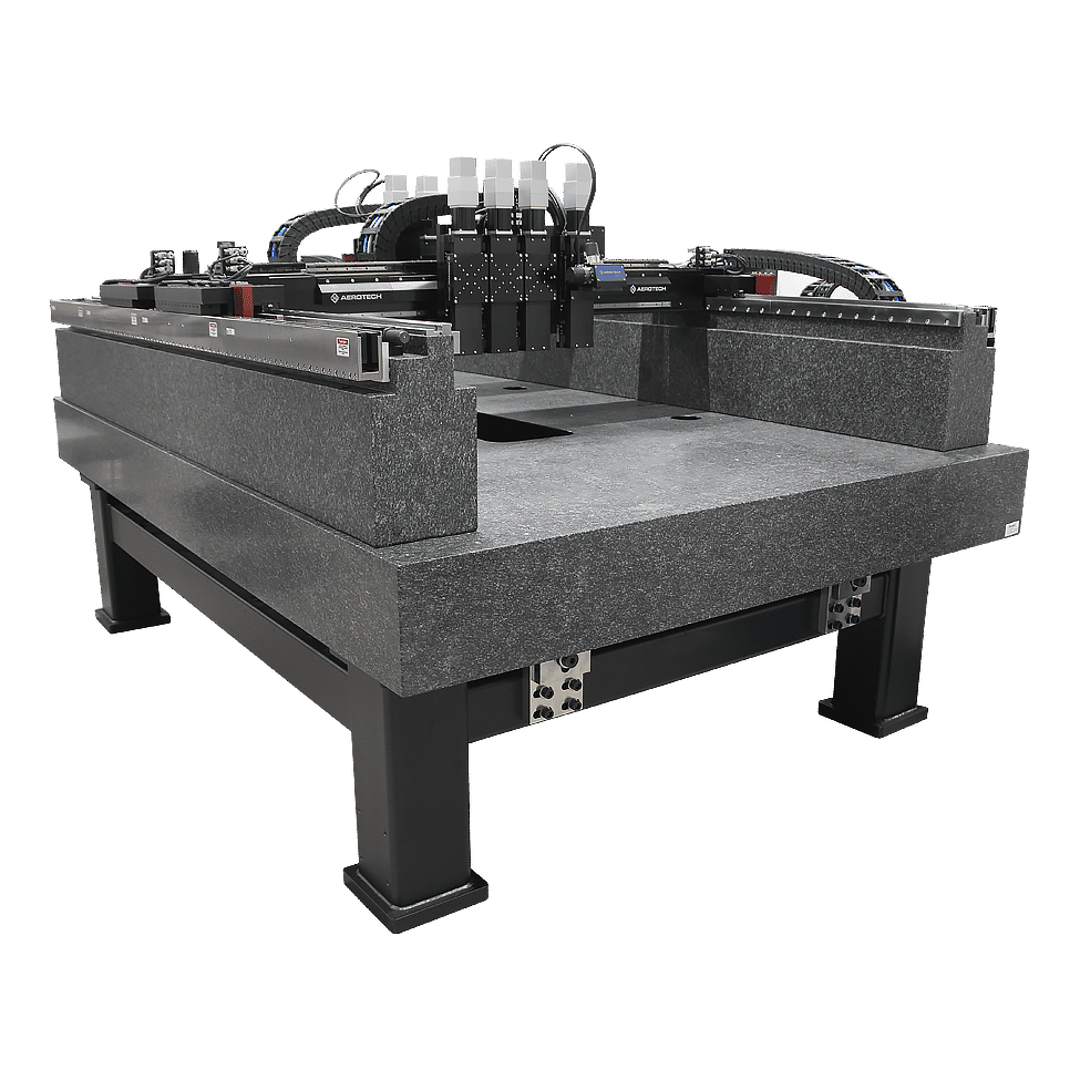 雙樑多載具龍門系統 (Dual-Bridge Multi-Head Gantry System) 提供靈活可配置的大型工作區域,搭配多個獨立橋架與八個獨立垂直軸,可搭載各類加工工具;此系統整合了先進的電纜管理設計與鋼製焊接結構,能有效維持高精度運動規格;適用於高精度揀放、元件對準與組裝、點膠及雷射加工等應用,全面提升製程效率與穩定性。