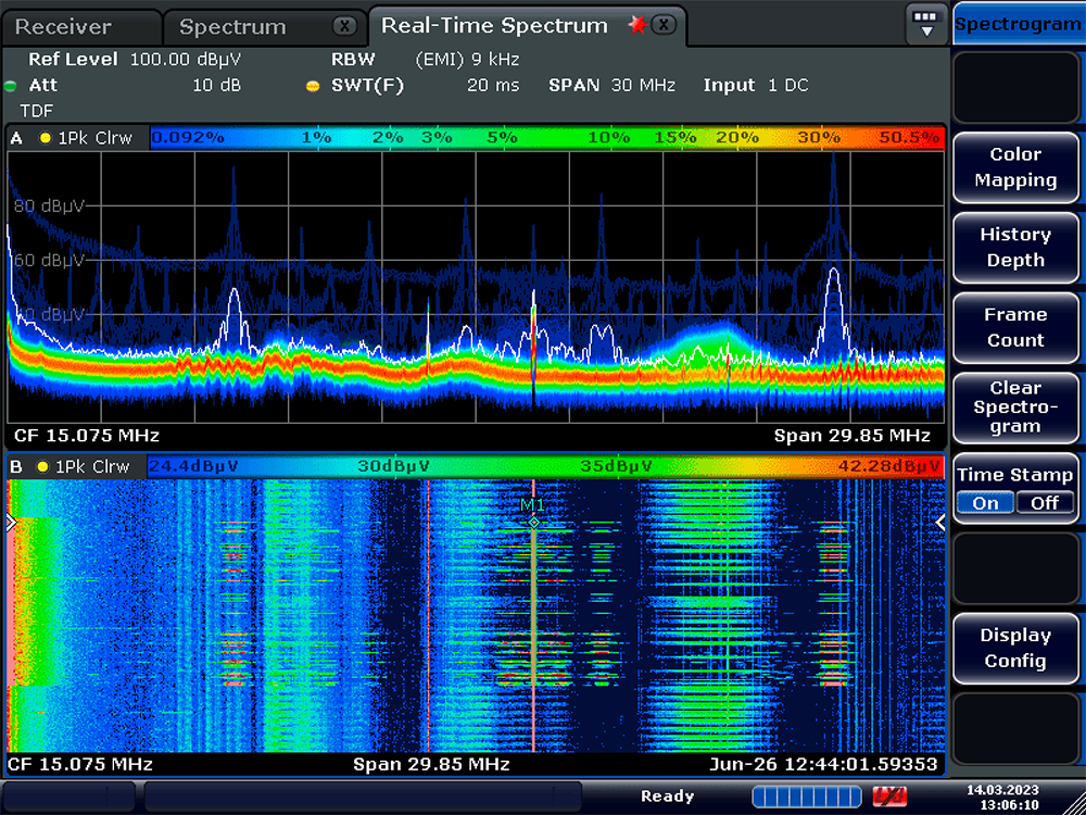 同時顯示餘輝模式下的干擾頻譜(上圖)與頻譜圖(下圖),頻譜圖提供了待測物 (DUT) 發出的干擾隨時間變化的無縫資訊,在餘輝模式中,使用者可以清楚區分窄頻和寬頻干擾,使用者選定的單個頻譜(餘輝模式中的白色軌跡)在時間上的位置,由標記 M1 在頻譜圖中指出,該標記可依需求定位。