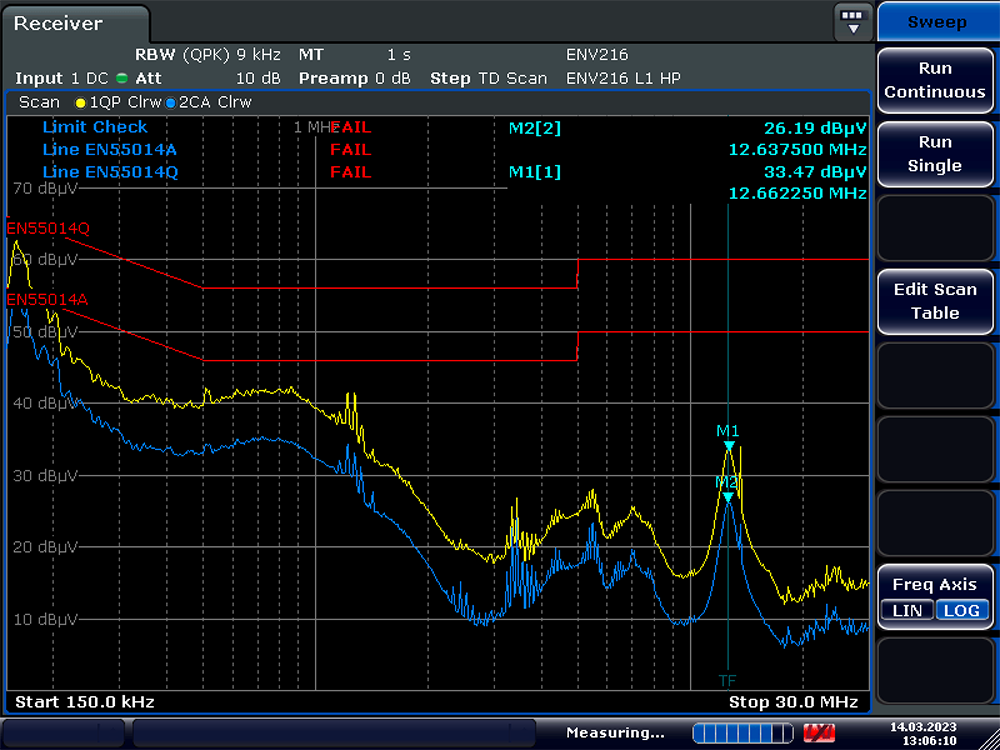 時域掃描功能在執行傳導干擾的加權量測時特別有用,例如:在符合 CISPR 產品發射標準的 150 kHz 至 30 MHz 頻率範圍內量測干擾電壓,R&S ESR 能即時量測此範圍,並立即執行所需的準峰值 (Quasi-peak) 和平均值 (Average) 加權,無需進行預掃描 (Preview scan)。