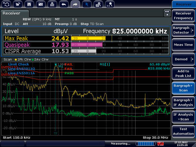 開關電源產生的干擾往往隨負載狀態波動,傳統接收器採用步進掃描,難以捕捉最高電平,R&S ESRP 的時域掃描能同時量測 CISPR Band B (150 kHz - 30 MHz) 上的 13,267 個頻點,僅需約 50 秒即可完成符合標準加權的完整干擾頻譜,讓使用者直接與限制線比對,大幅提升效率。