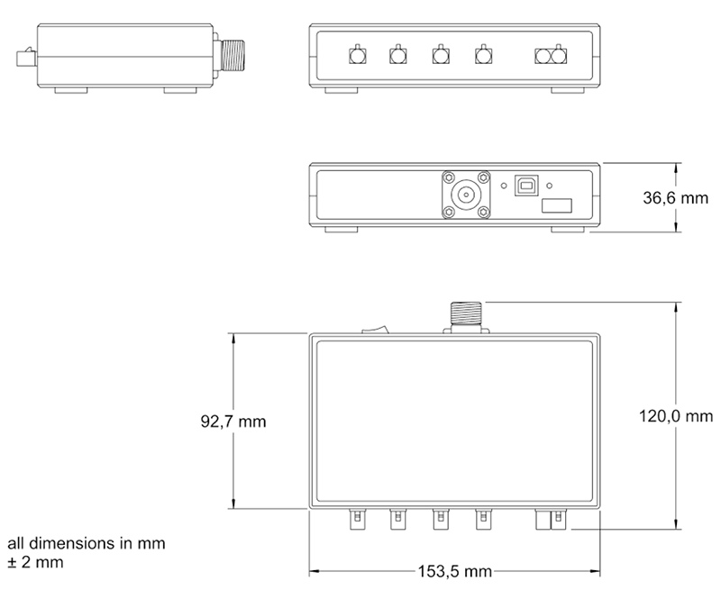 FDMX2-PT 機身採整塊鋁材 CNC 加工製成,具備優異的電磁遮蔽能力,可避免來自環境中無線電訊號的干擾,內建直流負載與電壓量測功能皆不需外接設備即可使用,減少因外部配線所造成之測試雜訊問題。多訊號輸入端使用 N 型母頭接頭,確保穩定連接。