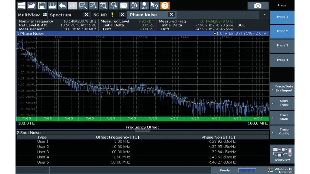 振盪器、頻率合成器和發射系統的開發人員將得益於 R&S FSW 分析儀在相位雜訊量測方面的出色射頻性能;在距載波 10 kHz 偏移處,以 1 Hz 解析頻寬量測,對於 1 GHz 載波,R&S FSW 的相位雜訊典型值為 -140 dBc;對於 10 GHz 載波,典型值為 -131 dBc;在 100 Hz 偏移處,其近載波相位雜訊也相當出色,典型值為 -114 dBc(1 Hz 解析頻寬);依據頻率和偏移範圍的變化,R&S FSW 性能優於其他高階分析儀達 10 dB 以上。