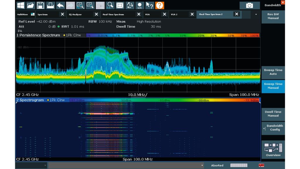 R&S FSW 即時選配允許使用者在最高 800 MHz 的頻寬內,即使在靠近強載波的情況下,也能可靠地偵測奈秒範圍內極短的偶發干擾,即時頻譜分析使用戶能夠分析現有的跳頻演算法,並建立替代方案,以防止在相同頻帶內運行的不同標準訊號之間發生衝突。