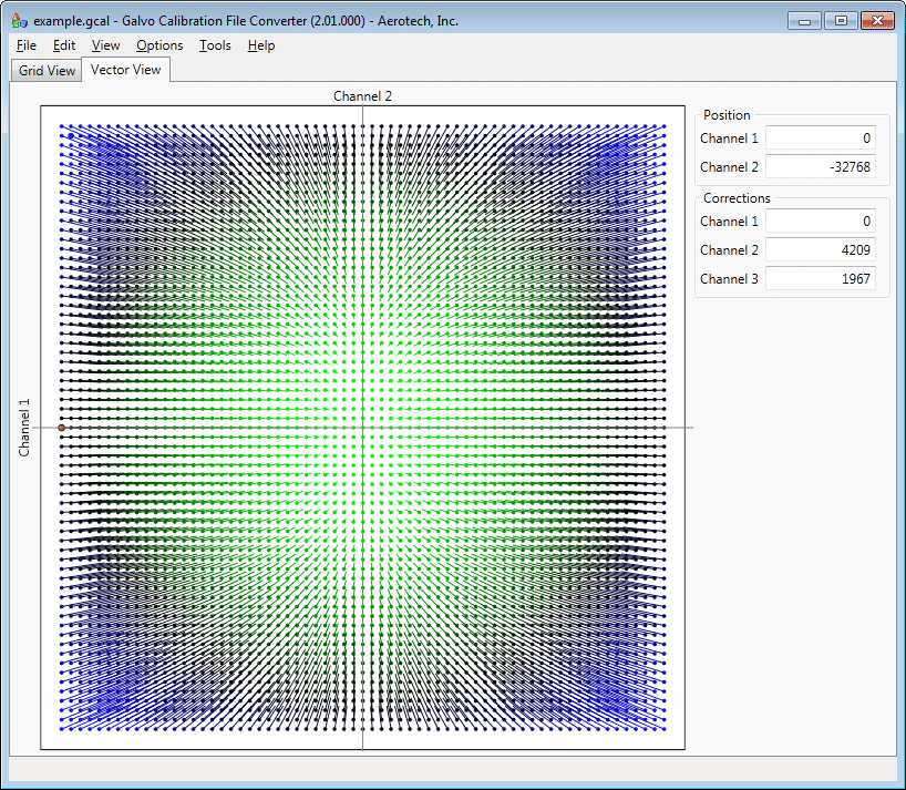 GalvoCFC 軟體的向量檢視(Vector View)模式,將校準數據圖形化為向量場,每個箭頭直觀地顯示了在掃描視野中特定點的校正方向與大小,協助工程師視覺化分析整個工作區域的失真分佈與補償情況,快速判讀校準成效。