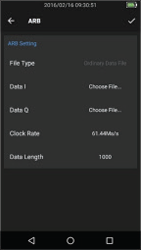 ARB(任意波形)功能允許使用者傳輸自訂的基頻資料,支援 .txt 與 .mat 格式的 IQ 資料,使用者需依據 IQ 資料檔案設定資料長度與訊號取樣率。