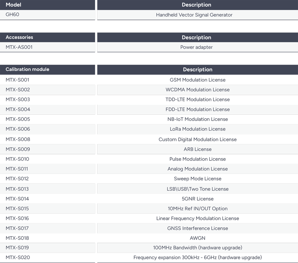 GeneHawk 手持式訊號產生器(GH60)具備極高的可攜性,非常適用於現場測試,並便於外出攜帶,其擁有優異的射頻(RF)效能,支援多種通用數位調變格式,涵蓋標準行動通訊格式,具備高動態範圍,使其成為多樣化應用情境中的理想工具;憑藉高達6 GHz的頻率範圍、小型化設計、直覺式使用者介面與高精度訊號產生能力,GH60 為需要同時兼具行動力與效能的專業人士提供可靠且靈活的解決方案。
