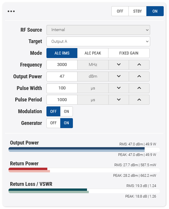 此機種具備內建功率感測功能,可即時監控輸出端的順向功率與反向功率值,協助使用者有效掌握待測物(DUT)的匹配狀態;透過此功能,可計算反射損失(Return Loss)與電壓駐波比(VSWR),評估天線或負載端的阻抗匹配品質。