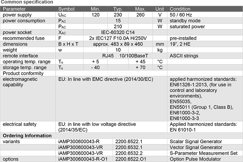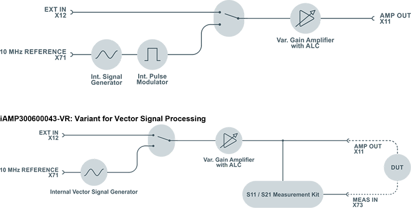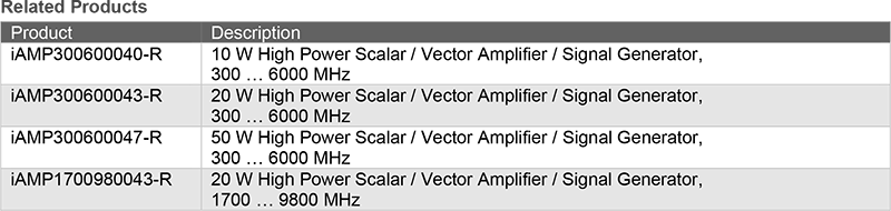iAMP300600040-VR 為此機種的變體版本,內建軟體定義之基頻訊號產生器(Baseband Generator)與 I/Q 調變器,可產生多標準、高功率向量訊號,適用於無線通訊、行動通訊、車用通訊與廣播應用測試場景;特別適合需模擬複雜訊號情境的驗證與研發應用。
