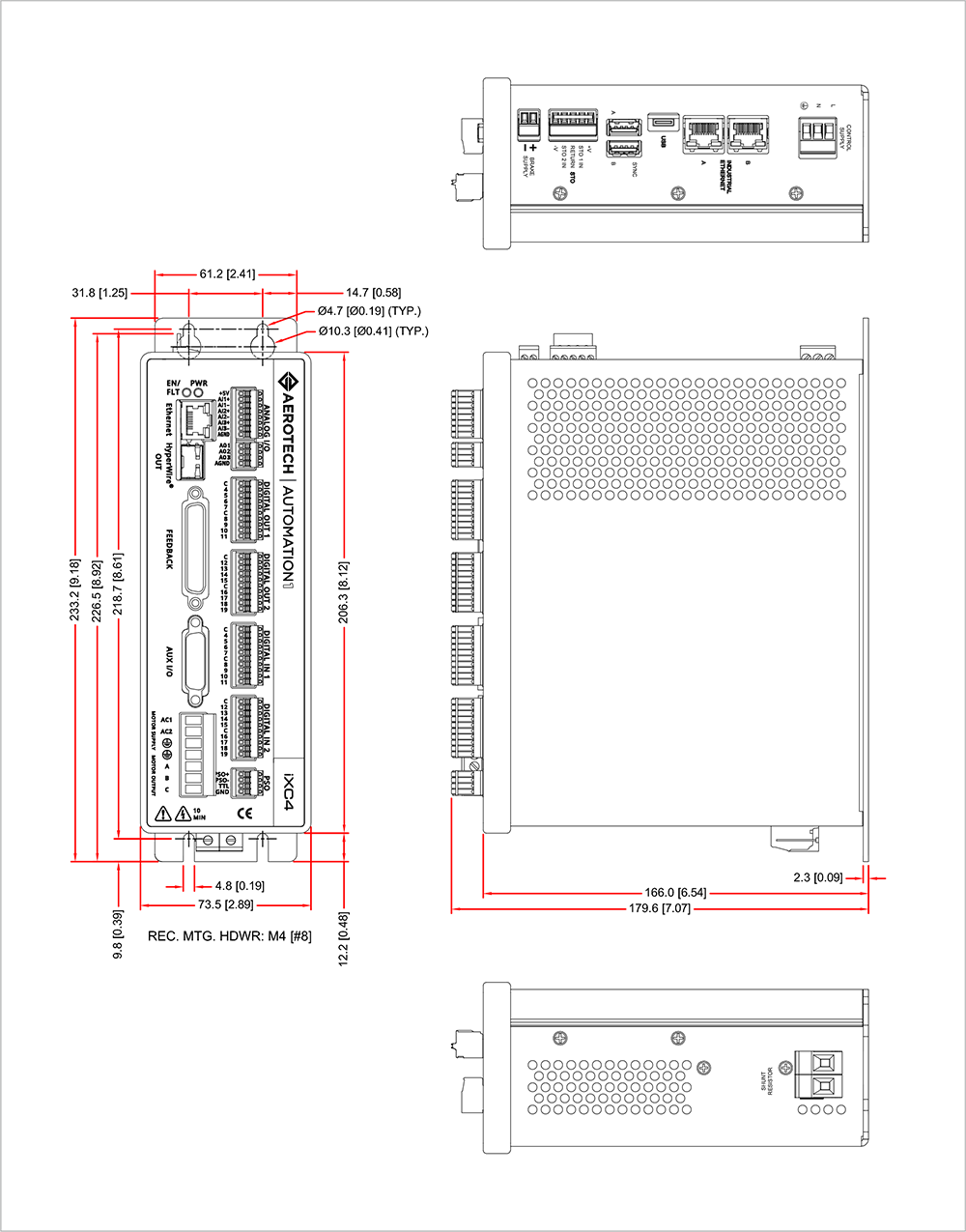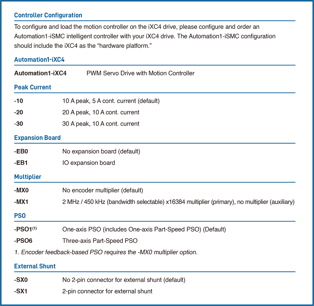 iXC4 的標準驅動器特點包括安全轉矩關閉 (STO, Safe Torque Off)、由超過 400 萬個 32 位元元素(16.7 MB)組成的資料陣列、數位與類比 I/O(詳見表格)、單軸位置同步輸出 (PSO)、專用的原點與行程終點極限輸入,以及一個增強型電流感測裝置,編碼器支援方面則包含方波、弦波及絕對型編碼器;標準的 iXC4 接受方波編碼器回授的速率高達每秒 4,000 萬次計數,透過選配的編碼器倍頻功能,弦波編碼器可被倍頻高達 16,384 倍,藉此產生高解析度的位置回授,每個單軸 iXC4 都可以配置 MX1 編碼器倍頻器,實現更高水準的位置與速度控制。