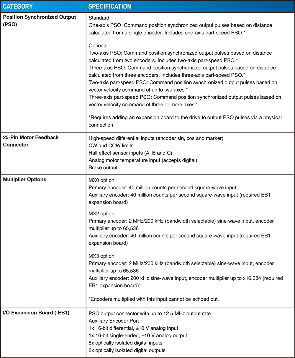標準功能包括安全轉矩關閉 (STO)、一個容量超過 67 MB 的資料陣列、專用的原點與行程終點極限輸入,以及一個強化的電流感測裝置,iXL2e 可接收方波與絕對值編碼器的回授訊號,透過選配的編碼器倍頻功能,您能將弦波編碼器的訊號倍頻達 65,536 倍,此外,該機種也支援雙倍頻與雙絕對值編碼器的回授功能。