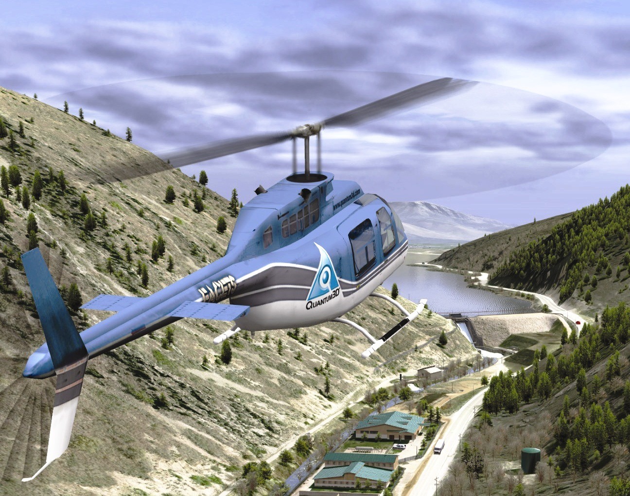 圖片中為一架模擬飛行環境中的直升機,飛越山谷與水壩區域,場景由 Quantum3D 的影像技術渲染,呈現高擬真度的地形、天氣與光影效果,適用於飛行訓練與軍事模擬應用。